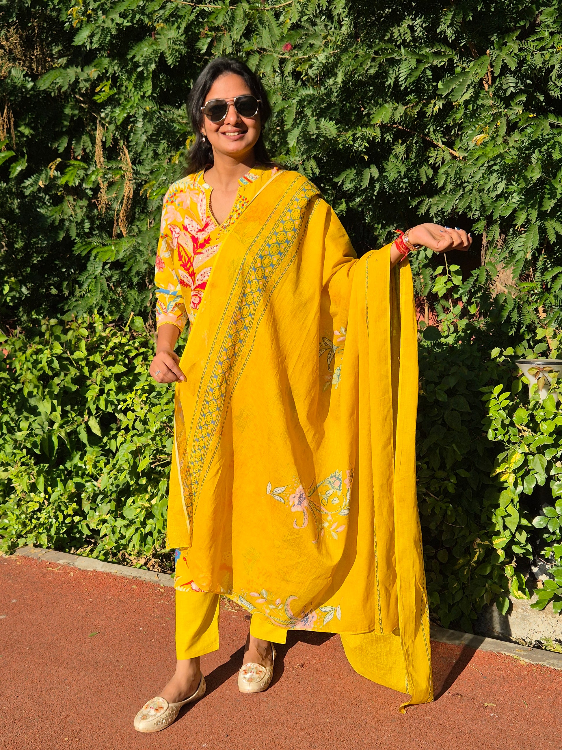 Bright Yellow Floral Cotton Suit Set with Dupatta