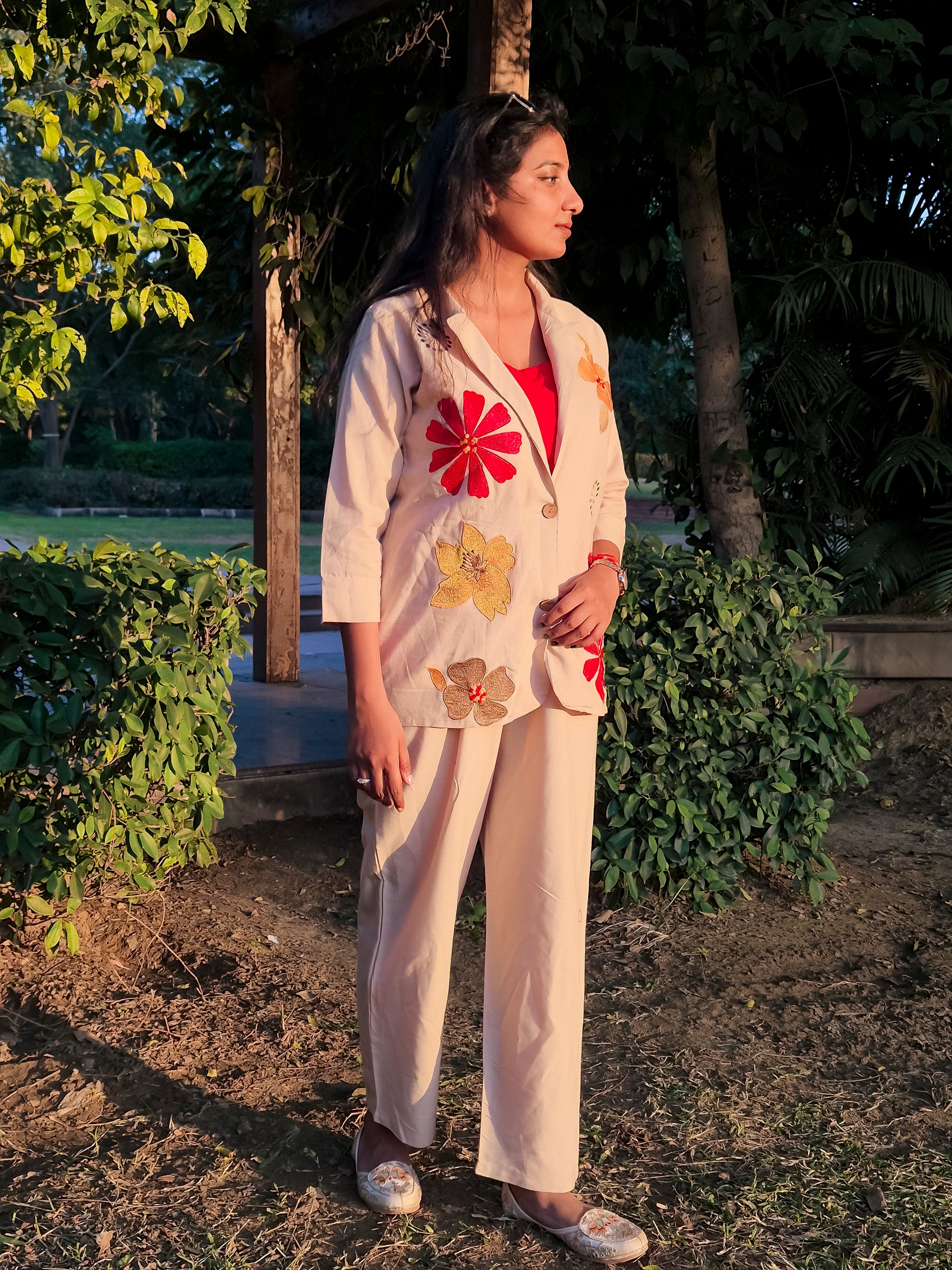 This co-ord set blends simplicity with statement style. The subtle beige canvas paired with bright floral embroidery makes it a standout piece—comfortable, artsy, and effortlessly fashionable.