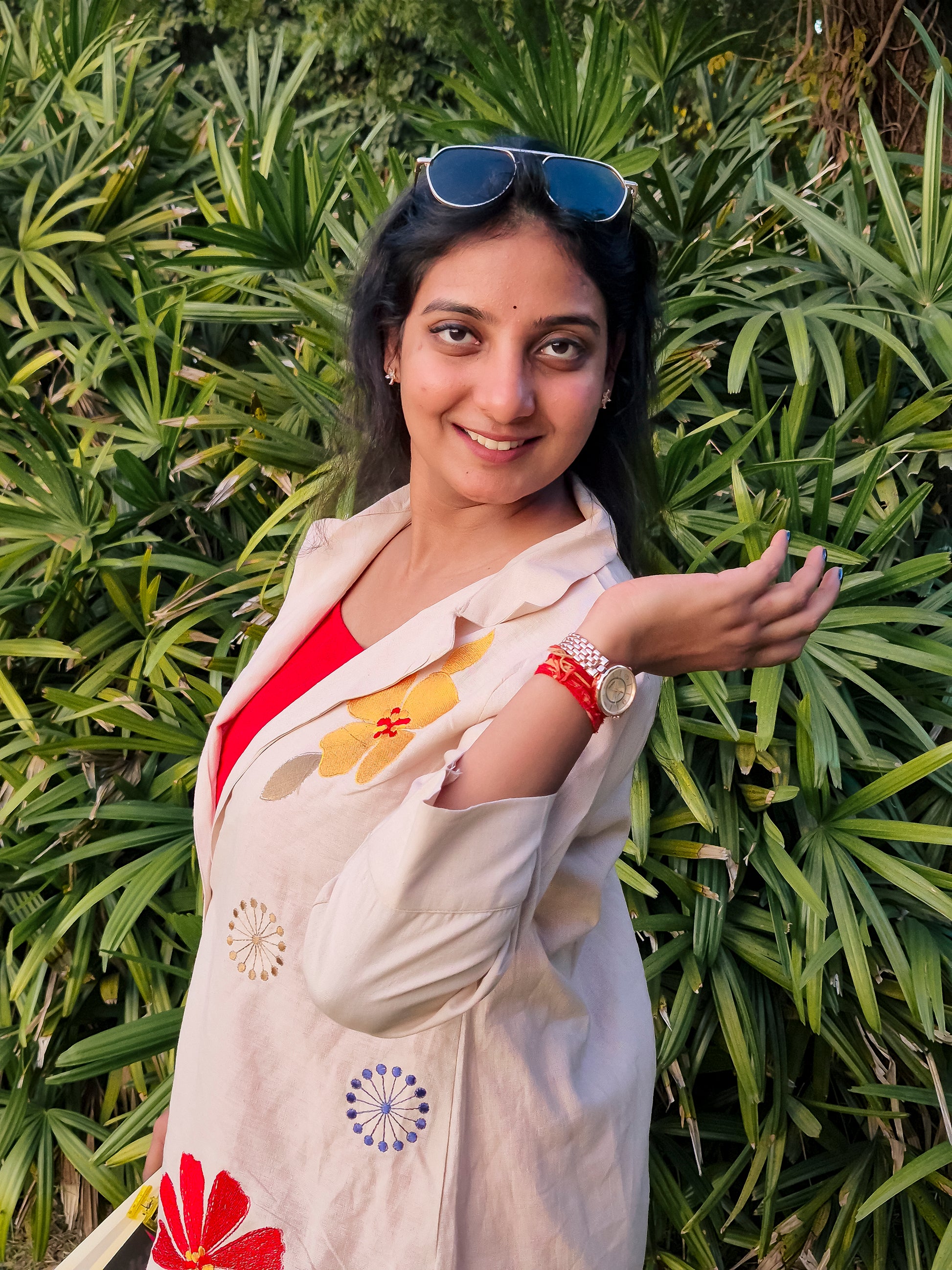 Statement Floral Embroidery: Stunning hand-embroidered motifs in shades of red, yellow, and gold, adding a playful yet sophisticated touch.