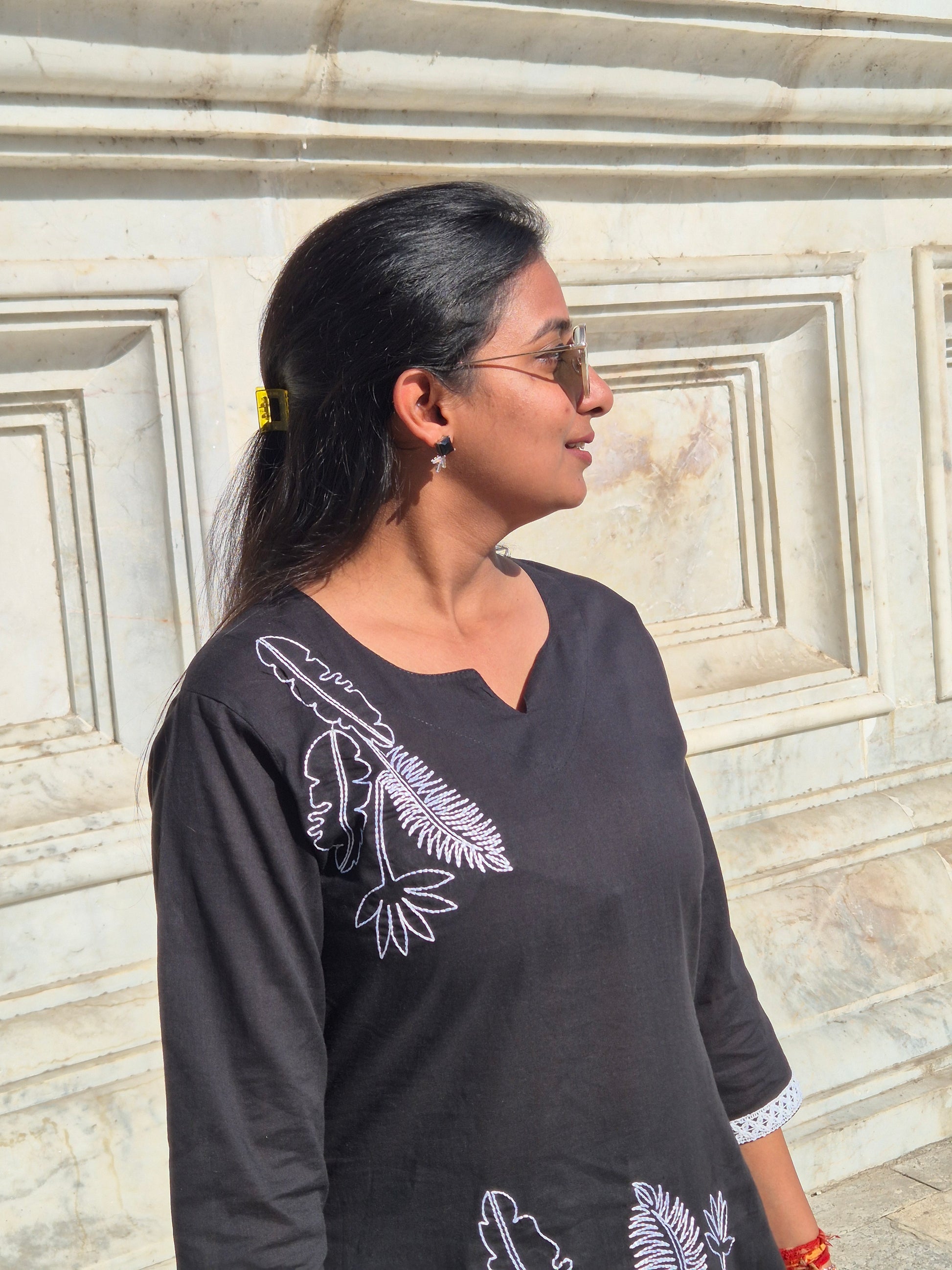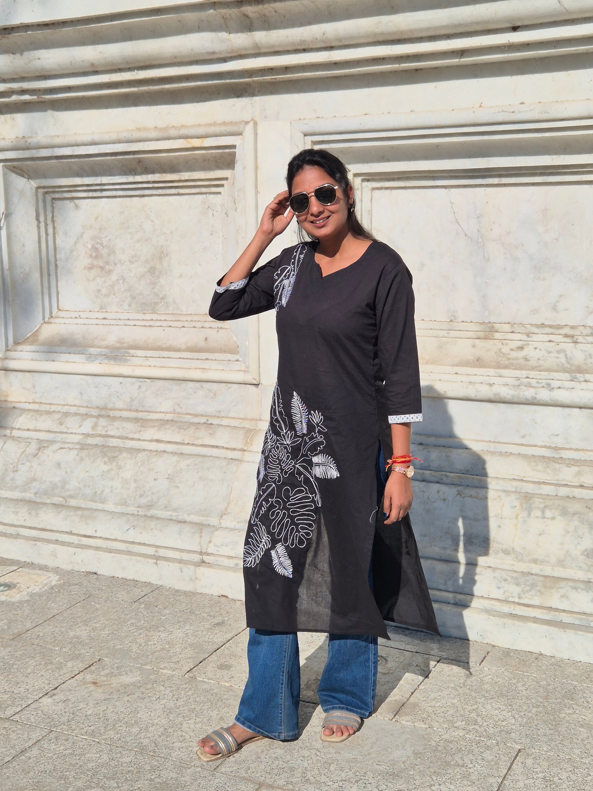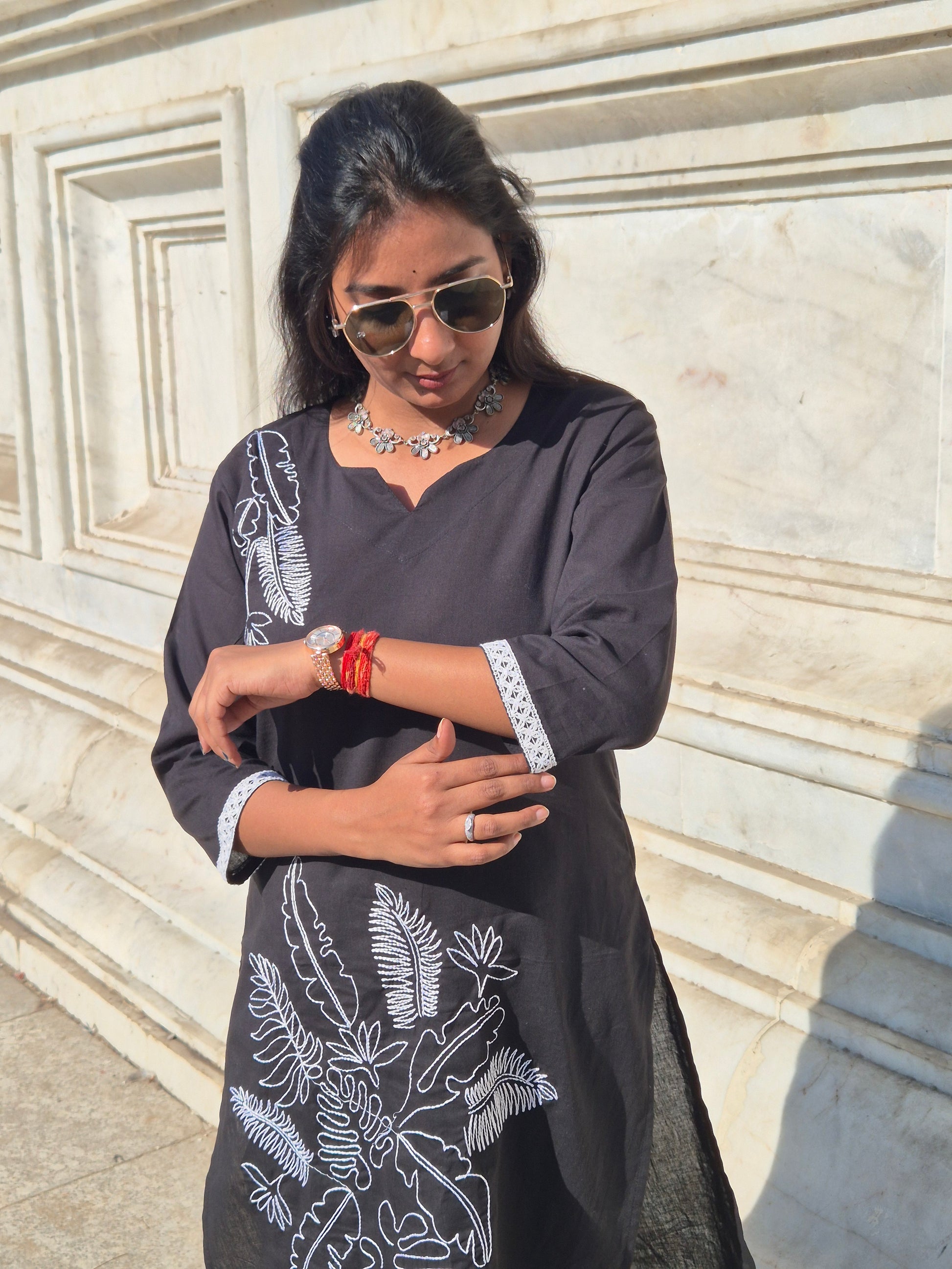Black embroidered kurta, cotton kurta for women, leaf embroidery kurta, everyday wear kurta, office wear cotton kurta, handcrafted design kurta.