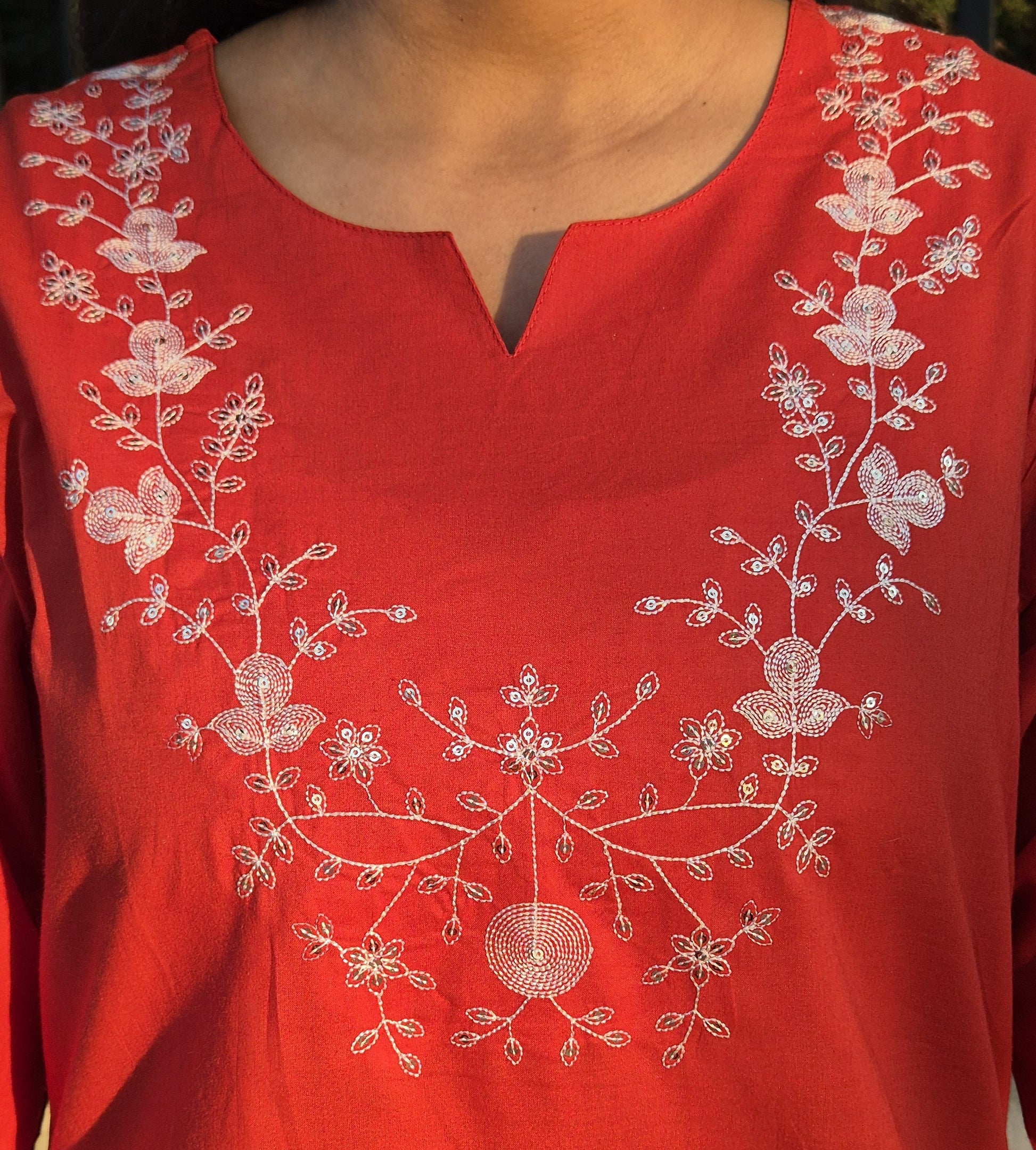 Beautiful White Floral Embroidery on the front yoke and shoulders — adds a handcrafted, elegant finish.